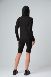 Кофта женская из трикотажного полотна с центральной бортовой застёжкой на молнию. Перед с отрезными бочками внизу с кокеткой переходящей в рукав. Спинка тоже с кокеткой, переходящей в рукав. Воротник-капюшон с кулисой и шнуром. На правом рукаве по низу декоративная нашивка. Длина по спинке 60 см, длина рукава 65 см.