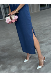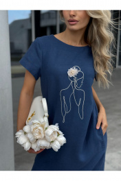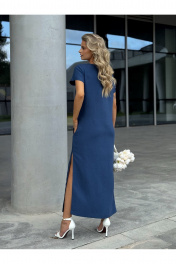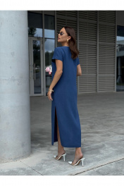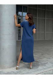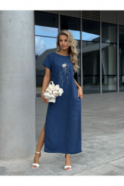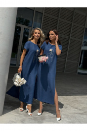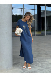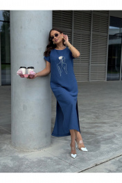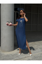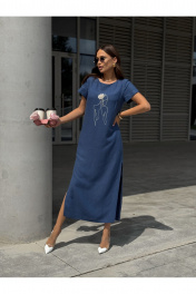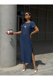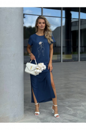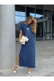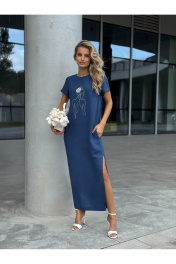 Платье женское прямого силуэта длинное. Перед - с нагрудными вытачками и печатью. Спинка без конструктивных элементов. В боковых швах обработаны карманы "в швах". В нижней части боковых швов обработаны разрезы. Вырез горловины - округлый. Рукава втачные одношовные короткие. Длина рукава – 17 см Длина блузки – 126,5 см.