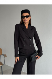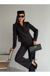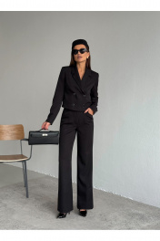 Костюм женский, двух-предметный, состоящий из жакета и брюк. Брюки- палаццо, прямые расширенные к низу, на притачном поясе со шлевками и застежкой на одну пуговицу. ЗП брюк с таллиевыми вытачками. ПП брюк с одной фиксированной складкой, боковыми карманами и застежкой на тесьму молнию в среднем шве брюк. Жакет укороченный, полуприлегающего силуэта, с втачным рукавом. Спинка с таллиевыми вытачками. Перед с нагрудными вытачками из бокового шва, центральной двубортной застежкой на две пары петель пуговиц и воротником пиджачного типа. Рукава втачные, двух-шовные с обработанной шлицей обманкой на 4 петли- пуговицы. Жакет на подкладке. Длина рукава жакета - 62,5 см Длина жакета - 47,3 - 48,3 см Длина брюк - 103,6см