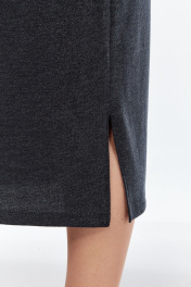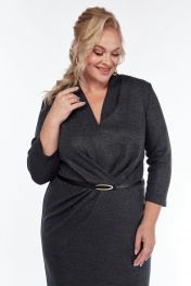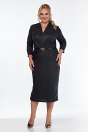 Платье женское полуприлегающего силуэта длиной до середины икры. Спинка со средним швом и разрезом снизу. Перед отрезной по линии талии. Лиф переда со средним швом и легкими складками в центре. Нижняя часть переда с 4-мя мягкими складками справа. Воротник стойка цельнокроенаая с лифом, образующая мягкие складки у основания шеи. Рукав втачной одношовный, длиной 3/4.