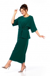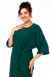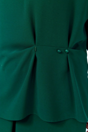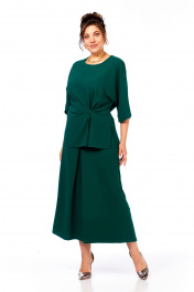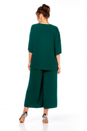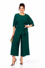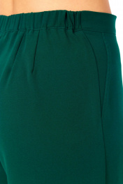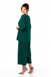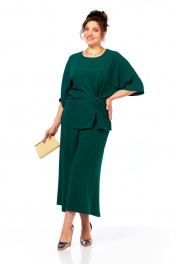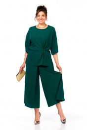 Комплект брючный состоит из блузы и кюлот. Блуза полуприлегающего силуэта с цельнокроенным рукавом. По боковым швамх разрезы, по переду застрочены вертикальные и горизонтальные складки в области талии (фиксируются навесной петлей и пуговицей). Кюлоты с центральной встречной складкой на передней половинке. Застежка-потайная тесьма-молния в боковом шве, верхний срез обработан поясом с резинкой. Имитация кармана в боковых швах. Длина по спинке 67 см, ширина плеча+длина рукава 43-45 см. Длина брюк 91 см.