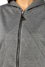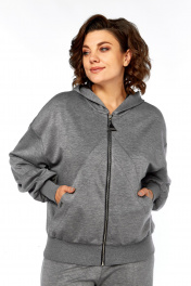 Комплект брючный кофта+брюки. Кофта свободного кроя с центральной застежкой на тесьму-молнию. Спущенная линия плеча, рукав втачной, 2-шовный с пританчым манжетом по низу (довяз). На локтевой части складки. По спинке средний шов. По переду рельефные швы-в швах обработаны карманы. По низу отделочный манжет (довяз). Капюшон со средней частью. Брюки широкие. Верхний срез обработан поясом с резинкой по спинке.В боковых швах обработаны карманы. В качестве отделки используется отделочная строчка и фурнитура. Длина по спинке 58 см, длина рукава 55 см. Длина брюк 110 см.