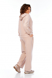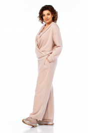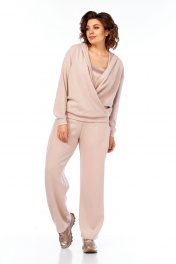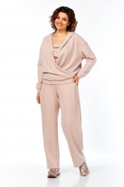 Комплект брючный состоит из кофты, топа и брюк. Кофта свободного кроя со спущенной линией плеча, на запах. Рукав втачной одношовный с манжетом по низу. Капюшон цельнокройный с передом по низу изделия, притачной пояс. Топ полуприлегающего силуэта на бретелях. по переду нагрудные вытачки. Бретели регулируются по длине. Брюки расширенные к низу, карманы в боковом шве, по переду линии притачивания, заложены складки. Верхний срез обработан поясом с резинкой. Длина кофты по спинке 61 см. Длина рукава 55 см. Длина топа по спинке 48 см. Длина брюк 104 см.