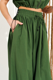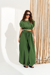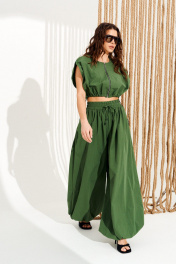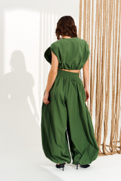 Комплект 2-х предметный, состоящий из блузона и брюк. Блузон свободного объема, прямого силуэта, с центральной застежкой на тесьму-молнию и фигурным вырезом проймы. Для регулировки объема по низу изделия предусмотрена кулиска с эластичным шнуром и фиксаторами. Горловина и борта обработаны цельнокроеными обтачками. Длина изделия на модели вдоль середины спинки — 39 см (допустимое отклонение +/- 1 см). Брюки большого объема. В боковых швах расположены карманы. Пояс притачной, на резинке с отделочными строчками, образующими кулиску, в которую продет шнур-завязка с наконечниками. Нижний срез брюк на резинке. Длина изделия на модели вдоль бокового шва с учетом пояса — 117,5 см (допустимое отклонение +/- 1 см)