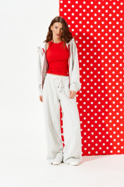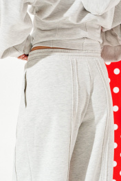 Брюки из трикотажного полотна свободного объема, прямого силуэта. Пояс притачной на резинке с отделочными строчками, образующими кулиску, в которую продет декоративный шнур-завязка с наконечниками. Детали переда и спинки с вертикальными швами вразутюжку с необработанными краями. В боковых швах расположены карманы.