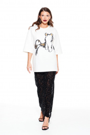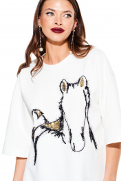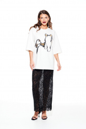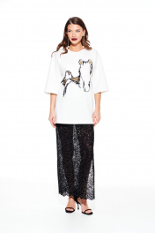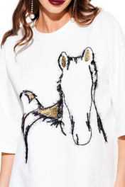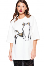 - ОписаниеДжемпер из трикотажного полотна, прямого силуэта, свободный, с круглым вырезом горловины. Перед и спинка цельные. По переду выполнена вышивка "Лошадь".