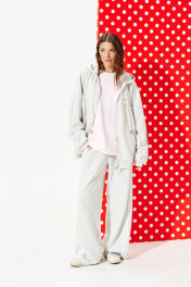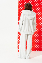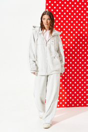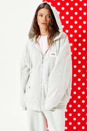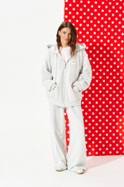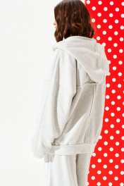 Толстовка из трикотажного полотна свободного объема, прямого силуэта, с капюшоном и центральной застежкой на тесьму-молнию. Детали переда с накладными карманами и отрезной кокеткой. На левой детали переда настрочная деталь с нашивкой. Спинка с отрезной кокеткой и средним швом. Рукав втачной, двухшовный, длинный. Низ изделия и рукава обработаны притачной манжетой. Капюшон на обтачке, одношовный, через обметанные петли в кулиску продет декоративный шнур с металлическими наконечниками. Кокетка и настрочная деталь переда, кокетка и средний шов спинки, шов капюшона, швы рукавов – с необработанным краем.