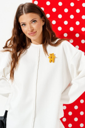 Джемпер из трикотажного полотна свободного объема, прямого силуэта, с круглым вырезом горловины. Перед и спинка со средним швом вразутюжку. Левая деталь переда со съемной брошью «Медвежонок». На спинке декоративная металлическая нашивка. Рукав втачной, одношовный, длинный. Низ изделия и рукава, средний шов переда и спинки с необработанным краем.
