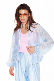 Блуза из трикотажного полотна, полуприлегающего силуэта, с круглым вырезом горловины. Горловина и проймы обработаны притачными бейками.