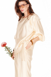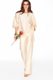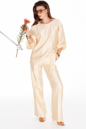 Блузка из костюмно-плательной ткани, свободного объема, прямого силуэта, с круглым вырезом горловины. Перед с нагрудными вытачками, с декоративной сборкой на резинку и бантом. Спинка цельная. Рукав 3/4, втачной, одношовный, с притачной манжетой со сборкой на резинку.