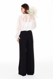 Блузка умеренного объема, прямого силуэта, с круглым вырезом горловины. По переду — центральный защип от горловины до линии низа. Спинка со средним швом и разрезом, с застежкой на навесную петлю и пуговицу. Рукав втачной, длинный, с разрезом, притачной манжетой с застежкой на 1 петлю и 1 пуговицу. Разрез рукава оформлен завязками из основной ткани.