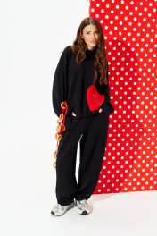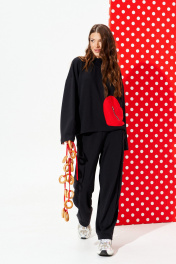 Комплект из трикотажного полотна, 2-х предметный, состоящий из джемпера и брюк. Джемпер свободного объема, прямого силуэта. Воротник-стойка. Перед и спинка цельные. Перед с декоративным карманом в виде сердца из контрастного материала с застежкой на тесьму-молнию. Рукав втачной, одношовный, длинный. Брюки свободного объема, слегка заужены к низу. Пояс притачной, на резинке, с отделочными строчками. Брюки с отрезной боковой частью, в которой обработан карман.
