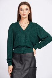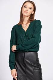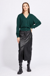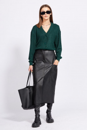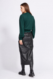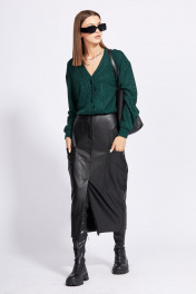 Юбка выполнена из экокожи. Юбка на притачном поясе, длиной до середины икры, зауженная к низу. Спереди накладные карманы, в среднем шве шлица и застежка на молнию с гульфиком и пришивную пуговицу. Горизонтальный подрез обработан спереди и сзади. Длина юбки с поясом: р.44-48 - 85 см, р.50-54 - 86 см.