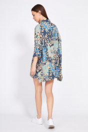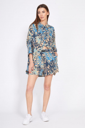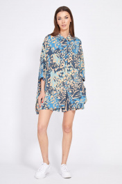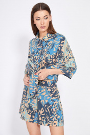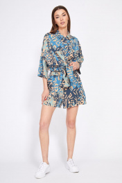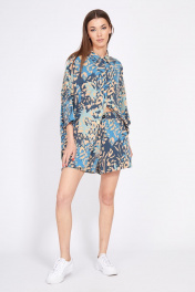 Комплект: блузка + шорты. Комплект выполнен из плательной ткани. Блузка прямого силуэта, покроя оверсайз, длиной ниже линии бедер. Спереди накладные нагрудные карманы и центральная застежка на пуговицы. Спинка цельная, длиннее переда. Воротник стояче-отложной. Плечевой шов спущен. Рукав рубашечного покроя, длиной ниже линии локтя. В боковых швах разрезы. Шорты на притачном поясе с эластичной тесьмой, длиной до середины бедра. В боковых швах карманы. Шорты декорированы нашивкой спереди по поясу. Длина блузки по центру спинки - 80 см. Длина рукава - 54 см Длина шорт - 39,5 см. 44 46 48 БЛУЗКА Длина по центру спинки 80 80 80 Длина рукава 54 54 54 Объем по груди 146 150 154 Объем по талии 140 144 148 Объем по бедрам 140 144 148 Объем рукава вверху 36 38 40 Объем рукава внизу 33 34 35 ШОРТЫ Длина по боковому шву 39,5 39,5 39,5 Объем по талии 62/92 66/96 70/100 Объем по бедрам 114 118 122 Ширина пояса 5 5 5