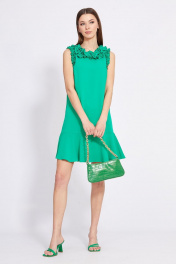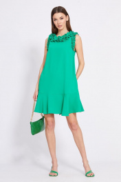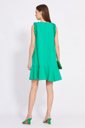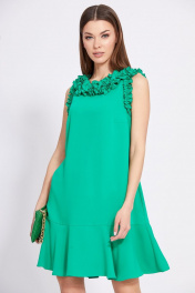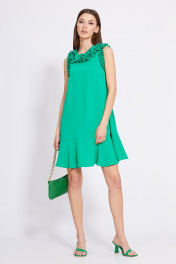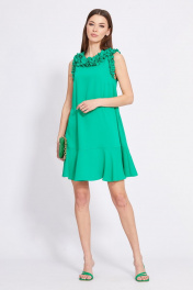 Платье выполнено из плательной ткани. Платье А-образного силуэта, длиной выше линии колена. Горловина округлой формы. Застежка на потайную молнию в среднем шве спинки. По низу платья широкий волан. Платье декорировано рюшами из основной ткани по проймам и горловине переда. Длина платья - 85 см. 42 44 46 Длина по центру спинки 85 85 85 Объем по груди 90 94 98 Объем по талии 102 106 110 Объем по бедрам 112 116 120 Объем по низу 262 266 270