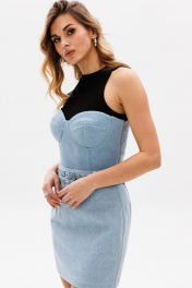 Топ выполнен из джинса, в виде корсета. Спереди два рельефа, в них вставлен регилин. На спинке между рельефами эластичная вставка для лучшей регулировки по обьему. В левом боковом шве застежка на молнию. Топ на подкладке и со съемными бретелями. Длина топа: 19 см. 44 46 48 Длина по центру спинки 19 19 19 Объем по груди 82/88 86/92 90/96 Объем по талии 62/68 66/72 70/76