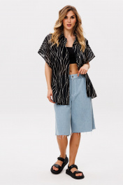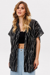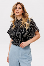 Блузка выполнена из плательно-блузочной ткани с принтом. Блузка прямого покроя, длиной до линии бедер. Спереди застежка с планкой на пуговицы. Спинка цельная. Воротник стояче-отложной. Плечевой шов удлинен. Рукав покроя "кимоно", длиной выше линии локтя. Длина блузки: р. 42-46 - 72,5 см, р. 48-52 - 74 см. Длина рукава: р. 42 - 33 см, р. 44 - 34 см, р. 46 - 35 см, р. 48 - 35,5 см, р. 50 - 36,5 см, р. 52 - 37,5 см.