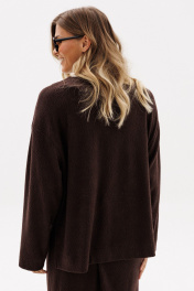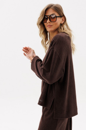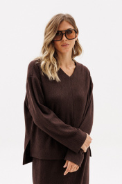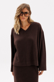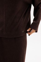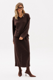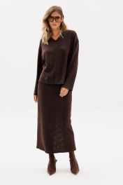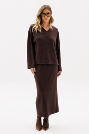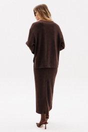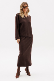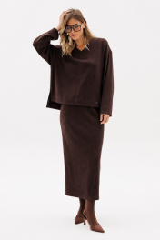 Комплект: джемпер + юбка. Комплект выполнен из трикотажного полотна с рисунком. Джемпер прямого силуэта, длиной до линии бедра. Перед со средним швом. Спинка цельная. Горловина V-образной формы. Плечевой шов спущен. Рукав рубашечного покроя, одношовный. В боковых швах разрезы. Спинка длиннее переда. Юбка слегка заужена к низу, на цельнокроенном поясе с эластичной тесьмой, длиной миди. Юбка без подкладки, сзади шлица в среднем шве. Длина джемпера: р.44-48 - 65 см, р.50-54 - 66,5 см. Длина рукава от горловины: р.44-48 - 73,5 см, р.50-54 - 75 см. Длина юбки: р.44-48 - 93 см, р.50-54 - 94 см. 44 46 48 50 52 54 ДЖЕМПЕР Длина по центру спинки 65 65 65 66,5 66,5 66,5 Длина рукава от горловины 73,5 73,5 73,5 75 75 75 Объем по груди 110 114 118 122 126 130 Объем по талии 107 111 115 119 123 127 Объем по низу 105 109 113 117 121 125 Объем рукава вверху 41 43 45 45 47 49 Объем рукава внизу 28 28 28 29,5 29,5 29,5 ЮБКА Длина по переду с поясом 93 93 93 94 94 94 Объем по талии 66/104 70/108 74/112 78/116 82/120 86/124 Объем по бедрам 95 99 103 107 111 115 Объем по низу 82 86 90 94 98 102 Ширина пояса 4 4 4 4 4 4