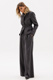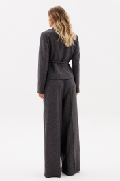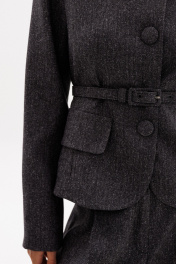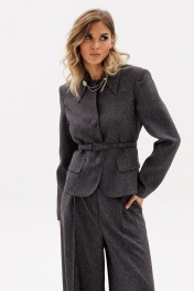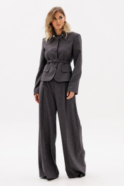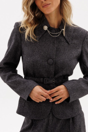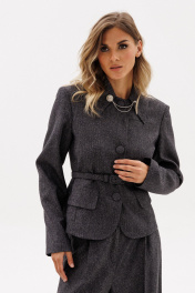 Жакет выполнен из костюмной ткани меланж. Жакет полуприлегающего силуэта длиной выше линии бедер. Спереди центральная застежка на пуговицы и декоративные клапаны. Воротник стояче-отложной. Спинка со средним швом. Рукав втачного покроя двухшовный. Жакет на притачной по низу подкладке. В комплект входит ремень из основной ткани с обтяжной пряжкой. Длина жакета: р. 44-48 - 57 см, р. 50-54 - 58,5 см. Длина рукава: р. 44-48 - 63 см, р. 50-54 - 64 см 44 46 48 50 52 54 Длина по центру спинки 57 57 57 58,5 58,5 58,5 Длина рукава 63 63 63 64 64 64 Объем по груди 96 100 104 108 112 116 Объем по талии 88 92 96 100 104 108 Объем по низу 102 106 110 114 118 122 Объем рукава вверху 36,5 38,5 40,5 40,5 42,5 44,5 Объем рукава внизу 27 27 27 29 29 29
