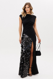 Платье выполнено из комбинации двух тканей: трикотажного полотна с блеском и крупных пайеток на сетке. Платье приталенного силуэта длиной в пол. Перед и спинка ассиметричные. Спереди драпировки от плеча и от линии талии. Горловина формы ""лодочка"". Правый плечевой шов удлинен. Нижняя часть платья на отлетной по низу подкладке. Длина платья: р. 42-46 - 148 см, р. 48-52 -149,5 см. 42 44 46 48 50 52 Длина по центру спинки 148 148 148 149,5 149,5 149,5 Длина рукава Объем по груди 84 88 92 96 100 104 Объем по талии 65 69 73 77 81 85 Объем по бедрам 86 90 94 98 102 106 Объем по низу 140 144 148 152 156 160