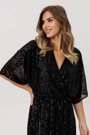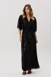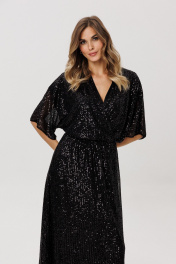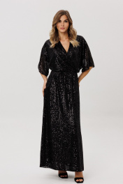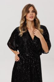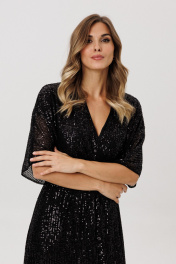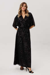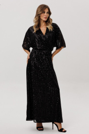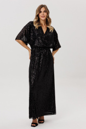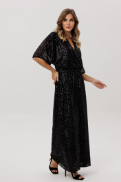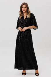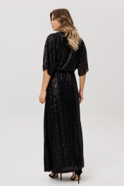 Платье выполнено из трикотажного полотна в пайетки. Платье X-образного силуэта, длиной миди, отрезное по линии талии. Лиф покроя кимоно. Перед выполнен на запах. Горловина V-образной формы. Переднее и заднее полотнище цельные и расширенные к низу. По линии талии эластичная тесьма. Платье на отлетной по низу трикотажной подкладке. Длина платья: р. 44-48 - 144 см, р. 50-54 - 145,5 см. Длина рукава: р. 44-48 - 46 см, р. 50-54 - 47,5 см. Гарантийный срок не установлен ГОСТ 31409-2009
