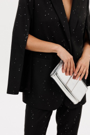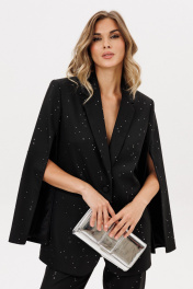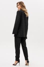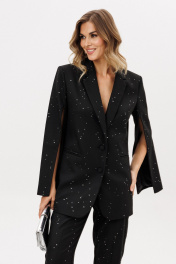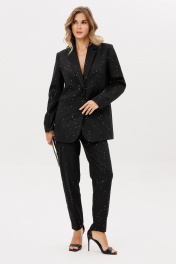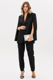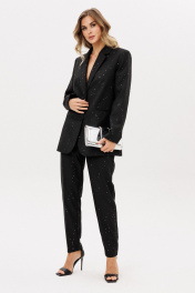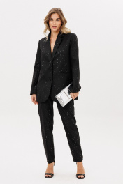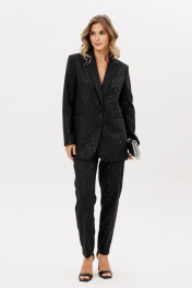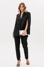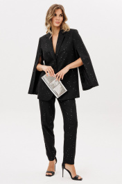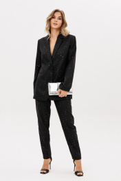 Комплект: жакет + брюки. Комплект выполнен из костюмной ткани с пайетками. Жакет прямого силуэта, длиной до линии бедер. Спереди застежка на пуговицы и прорезные карманы. Жакет по низу закругленной формы. На спинке средний шов. Воротник пиджачного типа. Рукав втачной, двухшовный, декорирован потайной молнией. Жакет на притачной по низу подкладке. Брюки зауженные к низу, длиной 7/8, на притачном поясе. Спереди боковые карманы с наклонным входом и застежка на молнию. Сзади декоративные карманы с листочкой. Длина жакета: р. 44-48 - 74 см. Длина рукава: р. 44-48 - 62, 5 см, р. 50-54 - 63,5 см. Длина брюк: р. 44-48 - 98,5 см, р. 50-54 - 99,5 см. Гарантийный срок не установлен ГОСТ 25295 - 2003