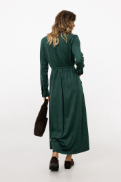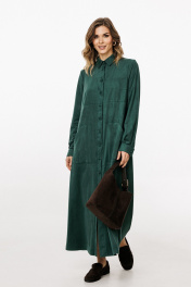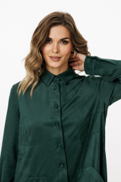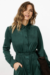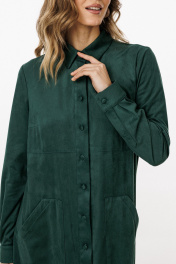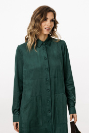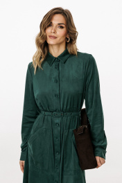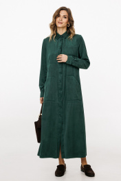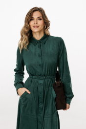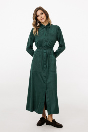 Платье выполнено из тонкой искусственной замши. Платье прямого силуэта, длиной миди. Спереди горизонтальные подрезы, накладные карманы и центральная застежка до верха с планкой на пуговицы. На спинке кокетка и встречная складка. Воротник стояче-отложной с отрезной стойкой и затежкой на пуговицу. Рукав втачной, одношовный. По низу рукава две складки и планка-обтачка. Низ рукава на притачной манжете с застежкой на пуговицу. В комплект входит ремень из основной ткани с обтяжной пряжкой. Длина платья: р. 42-46 - 133 см, р. 48-52 - 134.5 см. Длина рукава: р. 42-46 - 64 см, р. 48-52 - 65 см. ПЛАТЬЕ м. 3027 42 44 46 48 50 52 Длина по центру спинки 133 133 133 134,5 134,5 134,5 Длина рукава 64 64 64 65 65 65 Объем по груди 51 53 55 57 59 61 Объем по талии 49 51 53 55 57 59 Объем по бедрам 54 56 58 60 62 64 Объем по низу 74 76 78 80 82 84 Объем рукава вверху 32 34 36 38 40 42 Объем рукава внизу 22 22 22 24 24 24