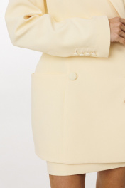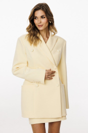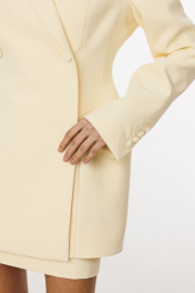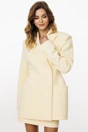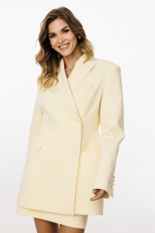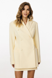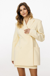 Жакет выполнен из костюмной ткани. Жакет К-образного силуэта, длиной ниже линии бедер. По переду обработаны рельефы от проймы до низа, талиевые вытачки, горизонтальные подрезы, переходящие на спинку, в которых обработаны карманы и лацканы. На спинке обработаны две пары рельефов от проймы до низа и средний шов. Воротник пиджачного типа. Жакет с плечевыми накладками, плечевой шов удлинен. Рукав втачной, двухшовный. По низу рукав обработан шлицей, застёгивающеюся на 4 петли и пуговицы. Жакет двубортный, на притачной по низу подкладке. _x000D_ Длина жакета - 77 см._x000D_ Длина рукава - 61 см._x000D_ Гарантийный срок не установлен_x000D_ ГОСТ 25295 - 2003_x000D_