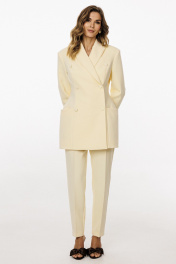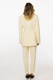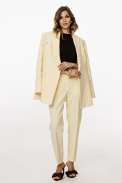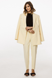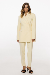 Жакет выполнен из костюмной ткани. Жакет К-образного силуэта, длиной ниже линии бедер. По переду обработаны рельефы от проймы до низа, талиевые вытачки, горизонтальные подрезы, переходящие на спинку, в которых обработаны карманы и лацканы. На спинке обработаны две пары рельефов от проймы до низа и средний шов. Воротник пиджачного типа. Жакет с плечевыми накладками, плечевой шов удлинен. Рукав втачной, двухшовный. По низу рукав обработан шлицей, застёгивающеюся на 4 петли и пуговицы. Жакет двубортный, на притачной по низу подкладке. _x000D_ Длина жакета - 77 см._x000D_ Длина рукава - 61 см._x000D_ Гарантийный срок не установлен_x000D_ ГОСТ 25295 - 2003_x000D_