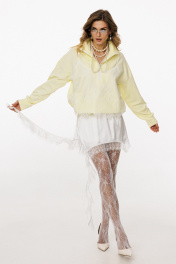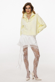Юбка выполнена из тонкого атласа. Юбка прямого силуэта, длиной выше линии колена. Юбка на цельнокроеном поясе с эластичной тесьмой. Низ юбки фигурной формы. Юбка декорирована по низу тесьмой-кружевом и воланом с одной стороны. Юбка на подкладке._x000D_ Длина юбки с поясом: р. 42-46 - 44 см._x000D_ Гарантийный срок не установлен_x000D_ ГОСТ 25294 - 2003