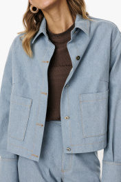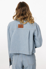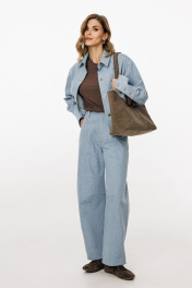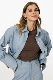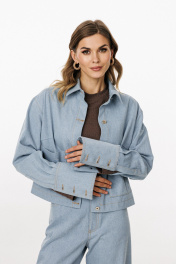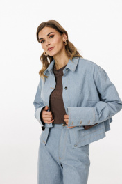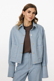 Блузка выполнена из плотного джинса. Блузка прямого силуэта, длиной ниже линии талии. Спереди накладные карманы и центральная застежка с планкой на пробивные пуговицы. На спинке кокетка и две складки. Воротник стояче-отложной с отрезной стойкой. Плечевой шов удлинен. Рукав рубашечного покроя, одношовный. Низ рукава на притачной манжете с застежкой на пробивные пуговицы. Рукав удлинен. Блузка декорирована по кокетке спинки нашивкой из натуральной кожи. Длина куртки: р. 44-48 - 49 см, р. 50-54 - 50.5 см. Длина рукава от горловины: р. 44-48 - 80 см, р. 50-54 - 81 см. БЛУЗКА м. 3042 44 46 48 50 52 54 Длина по центру спинки 49 49 49 50,5 50,5 50,5 Длина рукава от горловины 80 80 80 81 81 81 Объем по груди 116 120 124 128 132 136 Объем по талии 122 126 130 134 138 140 Объем по низу 124 128 132 136 140 144 Объем рукава вверху 37,5 39,5 41,5 41,5 43,5 45,5 Объем рукава внизу 25 25 25 27 27 27