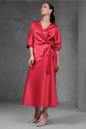 Костюм элегантный состоящий из блузки и юбки.Блуза свободного силуэта на запах с цельнокроенным рукавом с заужением к низу.Свободный, струящийся силуэт дарит ощущение абсолютного комфорта и не сковывает движений.Юбка женская А-образного силуэта с потайной молнией, длиной миди .