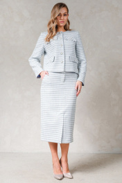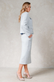 Костюм состоящий из жакета женского, полуприлегающего силуэта с круглым вырезом горловины. Застежка выполнена на петли и пуговицы. Втачной рукав. По переду присутствуют декоративные клапоны. Жакет выполнен на подкладке.Юбка женская, со шлицей по переду. Пояс на застежку молнию, По боковым швам расболожены карманы с отрезым бочком. Длина юбки ниже колена, с подкладкой.