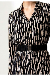 Стильное платье миди с оригинальным абстрактным принтом в черно-белой гамме. Модель приталенного кроя с классическим воротником и длинными рукавами на манжетах. Акцент на талии создаёт широкий чёрный ремень с пряжкой, подчёркивающий женственную фигуру. Лёгкая и струящаяся ткань обеспечивает комфорт и элегантность в носке. Идеальный выбор для создания утончённого образа как на каждый день, так и для особых случаев.