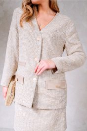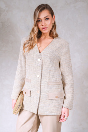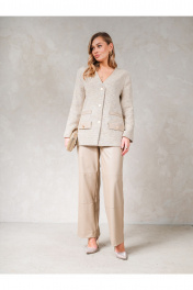 Жакет женский, полуприлегающего силуэта. Воротник и лацкон пиджачного типа. Двухбортная застежка на петли и пуговицы. По переду карматы с клапоном с листочкой. Втачной рукав. Жакет выполнен на подкладке.