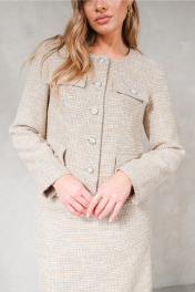 Жакет женский, полуприлегающего силуэта с круглым вырезом горловины. Застежка выполнена на петли и пуговицы. Втачной рукав. По переду присутствуют декоративные клапоны. Жакет выполнен на подкладке.