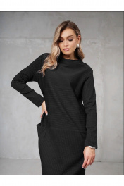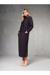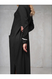 Платье прямого силуэта с цельнокраеной мягкой стойкой. Рукава узкие, длинные. Впереди, отрезное по линии бедер с карманами в шве. Сбоку высокий разрез.