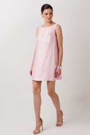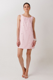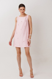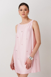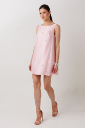 Платье со стразами ERTANNO умеренного объёма А-силуэта выполнено в нежном розовом оттенке. Розовый цвет придаёт образу лёгкость, романтичность и особую женственность. Этот мягкий цвет выглядит свежо и утончённо, красиво подчёркивая нежность ткани и делая образ по-настоящему элегантным. Платье длиной до середины бедра с изящной вышивкой стразами, которая деликатно мерцает при движении. Платье без рукавов, с V-образным вырезом спинки, что добавляет силуэту изящества и визуальной лёгкости. Модель выполнена на подкладке, благодаря чему платье комфортно садится по фигуре и выглядит особенно аккуратно. Идеальный выбор для нарядных выходов и стильных летних образов.На модели размер 44 Параметры модели: рост-175 см, 82-67-91