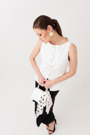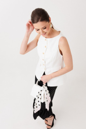 Жилет в молочном оттенке ERTANNO выглядит мягко и благородно, словно лёгкий свет утреннего солнца. Этот цвет придаёт образу свежесть, ощущение спокойной роскоши, и становится элегантной основой гардероба. Модель малого объёма, полуприлегающего силуэта, длиной до линии бёдер, аккуратно подчёркивает фигуру и создаёт изящный, структурный силуэт. Перед выполнен с рельефами из проймы и дополнен прорезными карманами с клапаном и листочкой. Эти детали добавляет образу аккуратной графики и утончённости. Центральная бортовая застёжка на шесть пуговиц и мягко скошенные углы борта делают силуэт особенно элегантным.На модели размер 44 Параметры модели: рост-175 см, 82-67-91 Спинка со средним швом и рельефами из проймы обеспечивает красивую посадку по фигуре. Вырез горловины в форме лодочки открывает линию шеи и придаёт образу женственность и лёгкость. Жилет выполнен на подкладке и прекрасно сочетается как с брюками и юбками, так и с более расслабленными образами, добавляя им нотку современного минимализма и благородной простоты.