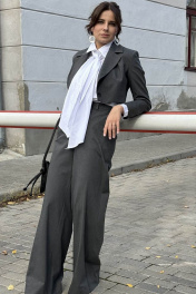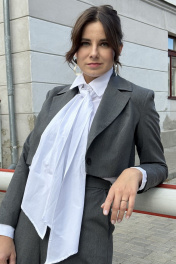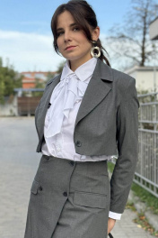 Стильный и элегантный жакет полуприлегающего силуэта станет прекрасным выбором для создания утонченного образа. Модель длиной до талии подчеркивает фигуру, а удлиненный плечевой шов добавляет изысканности. Уникальная конструкция с отсутствием бокового шва и моделированным бочком делает жакет комфортным и идеально сидящим. Нагрудная выточка переведена в талиевую, что визуально подчеркивает линии силуэта. Спинка с центральным швом и плечевыми вытачками гарантирует точную посадку. Двухшовные втачные рукава с декоративными пуговицами по локтевому шву низа добавляют классический акцент. Воротник английского стиля и центральная застежка на обметанную петлю с пуговицей завершают безупречный дизайн. Жакет выполнен в универсальном темно-сером цвете и малым объемом по груди и обхвату плеча. Отлично сочетается с другими элементами нашей коллекции, включая брюки и юбки в аналогичном цвете, для создания гармоничных комплектов. На рост 170см. Параметры модели: рост- 173см,ог90,от74,об98, на модели р44. Длина по спинке: 38 см, длина рукава: 58см, длина плеча-14см Обмеры готового изделия: 42р -ог(92см),от(86см); 44р –Ог(96см), от(90см); 46р –ог (100см), от(92см)