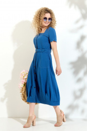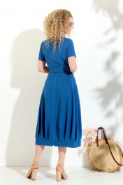 Платье женское выполнено из льна вишера, отрезное по линии талии. Горловина изделия трапеция, с накладными отстроченными деталями в области лифа. По переду изделия расположена функциональная планка с застежкой на кнопки. Юбка платья с широкими складками и фигурной планкой по низу. По переду юбки расположены накладные функциональные карманы. Рукав втачной короткий с фигурной манжетой по низу рукава. В комплект входит съемный пояс
