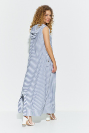 Сарафан женский выполнен из ткани лен-вишер. По полочке выполнены декоративные разрезы. Центр переда разрезной с функционально молнией по горловине. В боковых швах карманы декорированные клапанами. Низ изделия фигурный. Спинка разрезная, Изделие с капюшоном. Длина изделия по центру спинки 102 см, длина изделия по боку от плеча 131 см