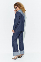 Костюм женский выполнен из денима (джинсы) состоит из джинсовой рубашки и брюк. Рубашка асимметричного кроя с декоративным подрезом и кокеткой, на полочках расположены потайные карманы с клапаном и рельефы.горловина- плосколежащий отложной воротник. Рукав вточной приспущенный, низ рукава обработан манжетой с застежкой петля- пуговица. Спинка изделия разрезная с рельефами и с декоративным асимметричным подрезом и бахромой. Низ рубашки обработан в открытый срез. застежка- петля- пуговица на планке. Брюки прямого кроя, завышенной посадки на притачном поясе. По переду Джинс -ассиметричная декоративная вставка с отделкой из бахромы, в боковых швах расположены карманы, на задней части брюк расположены накладные карманы. Низ брюк с широкой подгибкой обработан в открытый край.