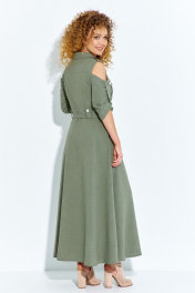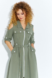 Платье полуприлегающего силуэта выполнено из льна-вишера. Воротник - отложная стойка. Рукав втачной - спущенный 3/4 с декоративными патами. Изделие отрезное по линии талии. Юбка изделия А-силуэта. В боковых швах функциональные карманы с клапаном. Застежка-молния