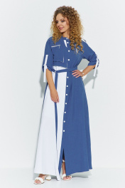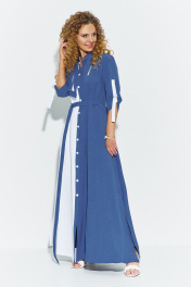 Платье женское свободного кроя выполнено из ткани лен-вишер, платье с планкой по переду и застежкой кнопки. На груди расположены накладные декоративные элементы с молниями. Рукав втачной, горловина стойка, по боковым швам от низа разрезы