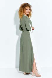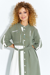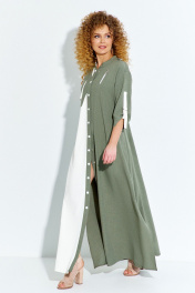 Платье женское свободного кроя выполнено из ткани лен-вишер, платье с планкой по переду и застежкой кнопки. На груди расположены накладные декоративные элементы с молниями. Рукав втачной, горловина стойка, по боковым швам от низа разрезы