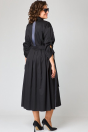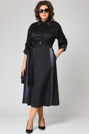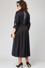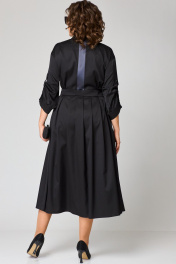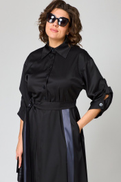 Платье женское нарядно-повседневное полуприлегающего силуэта до талии и расширенное к низу. Выполнено из плательной ткани в сочетании с отделкой. Платье отгрезное по талии. В боковых швах обработаны карманы, по переду юбки отделочные ввставки в виде вертикальных полос и центральный шов с разрезом, по спинке встречные склада. Вырез горловы воротник на стойке рубашечного типа. Застежка до талии на обментанные петли и пуговицы. Рукав втачной 7/8 по низу на притачной манжете, в рукаве отделочная пата с помощью которой можно регулировать длину рукава. Декором платья служат вставки из отделочной ткани и пуговицы. Подходит на рост 164-170