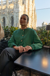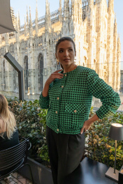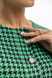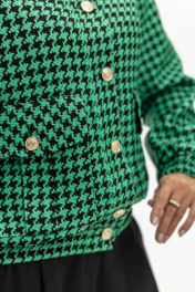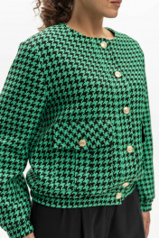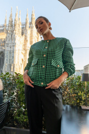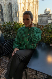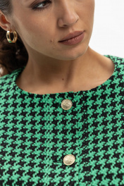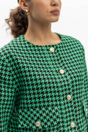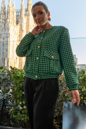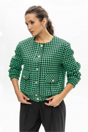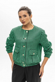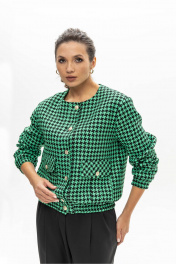 Бомбер - хорошее дополнение к межсезонному гардеробу. Фактурная ткань из вискозы с добавлением полиэстера, отлично держит форму, черно-зеленая расцветка с узором гусиной лапки, карманы с клапанами и спущенная линия плеча. Бомбер идеально сочетается с классическими элегантрыми брюками, юбкой или джинсами, подойдет как для офисной, так и для городской моды.
