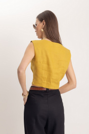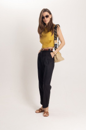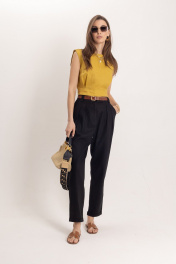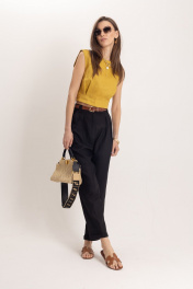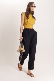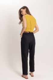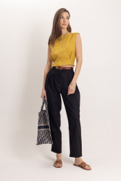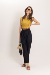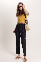 Комплект: топ и брюки из премиального льна. Стильный женский топ, выполнен из 100% льна, в богатом горчичном цвете, отлично подчеркнет летний загар. Топ идеально сочетается с элегантными брюками для офисной и вечерней моды. Комплект гармонично смотрится с аксессуарами из золота или жемчуга, такой комплект может быть любимым элементом вашего гардероба. Брюки женские классические черного цвета из льняной ткани, зауженные к низу. Верхний срез брюк обработан притачным поясом с отрезными шлёвками, мягкие складки отлично скроют недостатки фигуры, сделают силуэт стройным, имеется пуговица из материала «кокос». Низ брюк обработан в подгибку. Универсальным вариантом также является очень модная на данный момент модель бананы длиной ⅞ Комплект выполнен изо льна премиум-качества в уже полюбившемся стиле old money. Данный элемент женского гардероба говорит о великолепном вкусе его обладательницы, а оригинальный дизайн и расцветка сделают ваш образ ещё более женственным и сексуальным.
