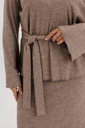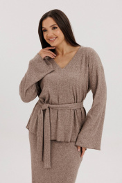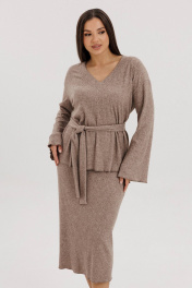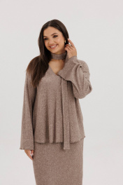 Трикотажный костюм, остаётся ли он модным, феминиста спорит до сих пор. С одной стороны, в соцсетях модных блогеров эти удобные комплекты буквально прописались, с другой, некоторые модели из трикотажа ой, как сложно назвать стильными - и где грань? Что отличает современный трикотажный костюм от его неактуальной версии? Первое - отсутствие лишних деталей, минимализм в этом вопросе - наше всё. Второе - у него есть ""воздух"", т.е. некоторый объём, который даёт свободную посадку и делает модель аккуратной и дорогой. Свободный джемпер с заниженной линией плеча, рукавом, расширенным к низу, и V-образным вырезом. Юбка прямая, длины миди, на эластичном поясе, с застёжкой в боковом шве на потайную молнию. Длина джемпера около 67 см. Длина рукава с плечом около 74 см. Длина юбки около 75 см.